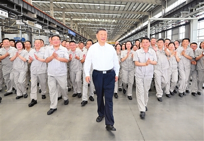 5月19日至20日,中共中央总书记、国家主席、中央军委主席习近平在河南考察。这是19日下午,习近平在洛阳轴承集团股份有限公司智能工厂考察时,同企业职工在一起。