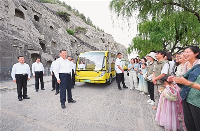 已有1500多年历史的龙门石窟,是重要的世界文化遗产。习近平来到这里,察看石窟整体布局风貌和代表性窟龛、造像,同现场的文物保护工作者亲切交流。他强调,要把这些中华文化瑰宝保护好、传承好、传播好。游客们见到总书记,都十分欣喜,纷纷向总书记问好。习近平不时同大家交流,特别鼓励小朋友们多到实地寻溯中华文化,从小树立文化自信。他指出,文旅融合前景广阔,要推动文旅产业高质量发展,真正打造成为支柱产业、民生产业、幸福产业。
