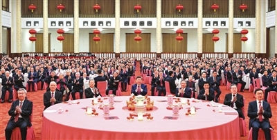 人民大会堂宴会厅灯光璀璨、喜气洋洋,各界人士2000多人欢聚一堂、共迎佳节,现场洋溢着欢乐祥和的节日气氛。