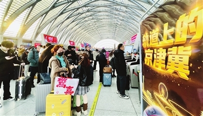 京津冀环线高铁抵达天津西站,旅客准备进站上车。