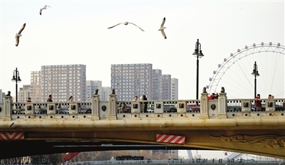连日来,海河河冰开化,大量红嘴鸥翔集。
