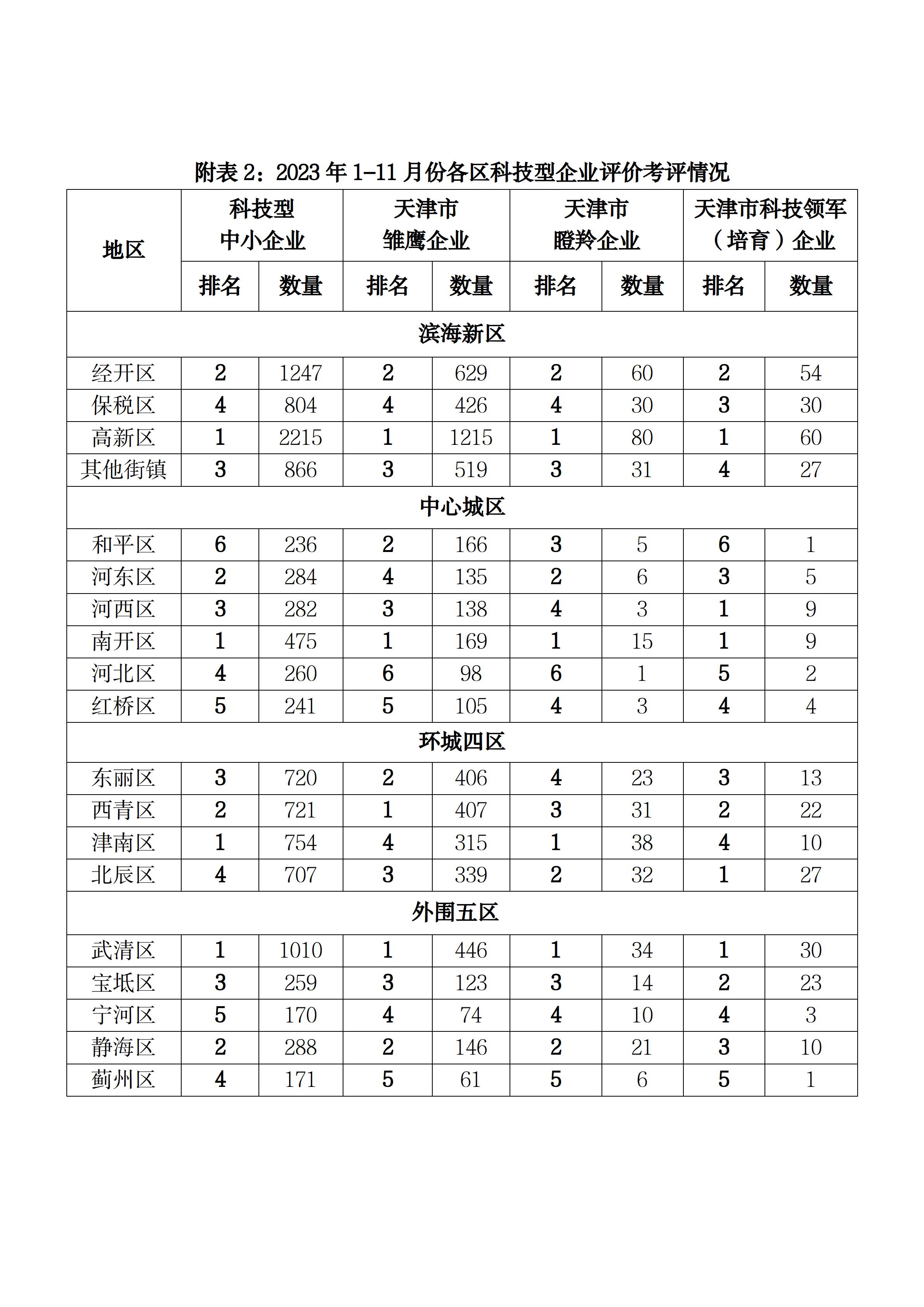 2023年1-11月份,全市11710家企业通过科技型中小企业评价入库;5917家企业通过天津市雏鹰企业评价入库;443家企业通过天津市瞪羚企业评价入库;天津市科技领军(培育)企业达到340家。