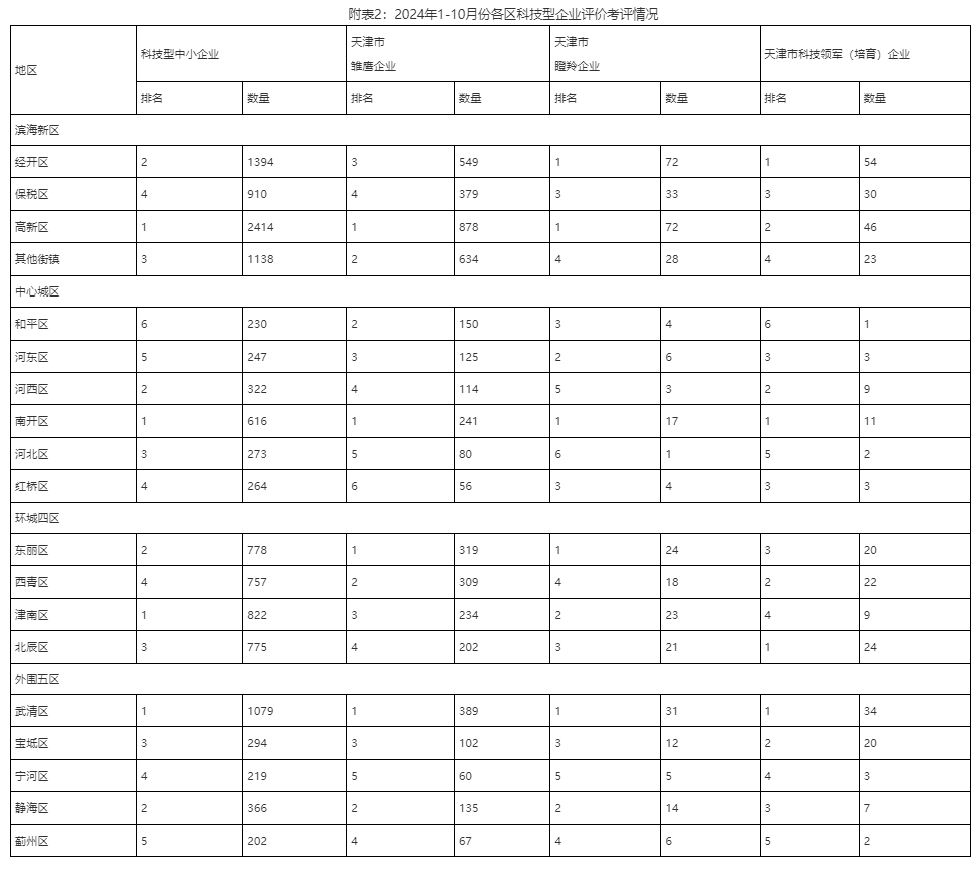 1-10月份,科技型中小企业评价入库数排名前五位的区是滨海新区(5856家)、武清区(1079家)、津南区(822家)、东丽区(778家)、北辰区(775)。