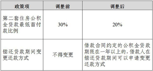 1.将第二套住房公积金贷款最低首付款比例由30%降至20%,可减轻缴存人使用公积金贷款购买改善性住房的首付款压力。