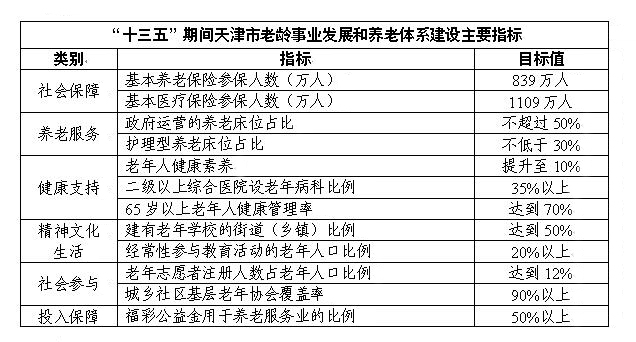天津市人民政府办公厅关于印发 天津市“十三五”老龄事业发展和 养老体系建设规划的通知 各区人民政府,各委、局,各直属单位: 经市人民政府同意,现将《天津市“十三五”老龄事业发展和养老体系建设规划》印发给你们,请照此执行。 天津市人民政府办公厅 2017年11月1日 天津市“十三五”老龄事业发展 和养老体系建设规划 为积极开展应对人口老龄化行动,推动老龄事业全面协调可持续发展,健全养老体系,根据《中华人民共和国老年人权益保障法》、《国务院关于印发“十三五”国家老龄事业发展和养老体系建设规划的通知》(国发〔2017〕13号)、《天津市实施〈中华人民共和国老年人权益保障法〉办法》和《天津市国民经济和社会发展第十三个五年规划纲要》,结合我市实际,制定本规划。 一、规划背景 (一)“十二五”时期取得的成绩。“十二五”时期,我市老龄事业和养老体系建设取得长足发展。《天津市老龄事业发展“十二五”规划》确定的目标任务基本完成。老年人权益保障和养老服务业发展等方面的法规政策不断完善,在全国率先出台了《天津市养老服务促进条例》地方性法规,养老服务迈入法治化轨道。基本养老、基本医疗保障覆盖面不断扩大,保障水平逐年提高;以居家为基础、社区为依托、机构为补充的养老服务体系基本建立,打造了具有天津特色的“973”养老服务格局,全市累计建设老年日间照料服务中心(站)1100个,实现了社区养老服务全覆盖;建设社区食堂、配餐中心386个,中心城区实现了社区老年助餐服务全覆盖;建设养老机构428家,全市养老床位达68616张,平均千名老人拥有床位32张。老年文化、体育、教育事业快速发展,老年人精神文化生活日益丰富;老年人优待项目更加丰富、范围进一步拓宽,敬老养老助老氛围日益浓厚,老年人的获得感和幸福感明显增强。 (二)“十三五”时期面临的形势。“十三五”时期是全面建成小康社会决胜阶段,是我市老龄事业改革发展和养老体系建设的重要战略窗口期。我市已经进入人口老龄化加速期,人口老龄化进程加速与养老服务业发展滞后的矛盾日益突出。一是老年人口基数大、发展快,截至2016年底,全市60岁以上户籍老年人口243.9万人,占全市户籍人口23.35%;预计到2020年,全市户籍老年人口将超过290万,占总人口比例26%。二是人口老龄化、高龄化、空巢化、家庭小型化“四化”叠加,产生放大效应,给应对人口老龄化增加了难度。三是“未富先老”、“未备先老”并存,应对人口老龄化准备不充分。四是老龄工作和养老体系建设体制机制尚不健全,人才队伍较为短缺,涉老政策碎片化;涉老部门沟通协调不顺畅、互通衔接不充分;养老服务有效供给不足,质量效益不高。 二、总体要求 (一)指导思想。高举中国特色社会主义伟大旗帜,全面贯彻党的十九大精神,深入学习贯彻习近平新时代中国特色社会主义思想,以习近平总书记对天津工作提出的“三个着力”重要要求为元为纲,认真落实党中央、国务院决策部署,围绕扎实推进“五位一体”总体布局、“四个全面”战略布局的天津实施,牢固树立和贯彻落实新发展理念,坚持党委领导、政府主导、社会参与、全民行动,着力强化思想观念转变、政策制度完善、事业产业协调、体制机制健全、老年人作用发挥,推动天津市老龄事业和养老体系全面协调可持续发展,进一步提升我市老年人获得感和幸福感。 (二)基本原则。 1.以人为本,共建共享。坚持保障和改善老年人民生,逐步增进老年人福祉,大力弘扬孝亲敬老、养老助老优秀传统文化,为老年人参与社会发展、社会力量参与老龄事业发展和养老体系建设提供更多更好支持,保障全体老年人参与社会发展和共享发展成果的权利,实现不分年龄、人人共建共享。 2.补齐短板,提质增效。坚持问题导向,注重质量效益,着力保基本、兜底线、补短板、调结构,不断健全完善社会保障制度体系,合理配置公共资源,强化薄弱环节,加大投入力度,注重提升养老服务有效供给和品质保障水平。 3.改革创新,激发活力。坚持政府引导、市场驱动,深化简政放权、放管结合、优化服务改革,不断增强政府依法履职能力,从供给导向转向以老年人需求为导向,加快形成统一开放、竞争有序的市场体系,保障公平竞争,改善营商环境,支持创业创新,激发市场活力。 4.统筹兼顾,协调发展。坚持把应对人口老龄化与促进经济社会发展相结合,促进老龄事业发展和养老体系建设城乡协调、区域协调、事业产业协调,统筹做好老年人经济保障、服务保障和精神关爱等制度安排,满足老年人多层次、多样化的健康养老服务需求,实现协调可持续发展。 (三)发展目标。到2020年,实现我市老龄事业发展整体水平明显提升,养老体系更加健全完善,及时应对、科学应对、综合应对人口老龄化的社会基础更加牢固。 1.多支柱、全覆盖、更加公平、更可持续的社会保障体系更加完善。实施全民参保计划,完善以增强公平性、适应流动性、保证可持续性为重点的社会保障体系,社会保险、社会福利、社会救助等社会保障制度和公益慈善事业有效衔接,为老年人提供基本生活、基本医疗、基本照护等多重保障。 2.居家为基础、社区为依托、机构为补充、医养相结合的养老服务体系更加健全。深化养老服务供给侧结构性改革,坚持城乡统筹,养老服