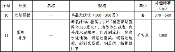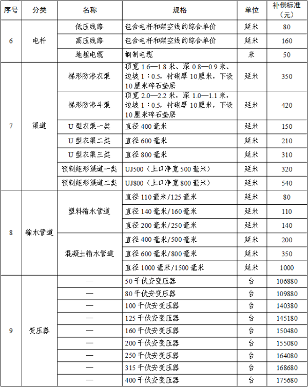 农田水利、电力设施补偿标准