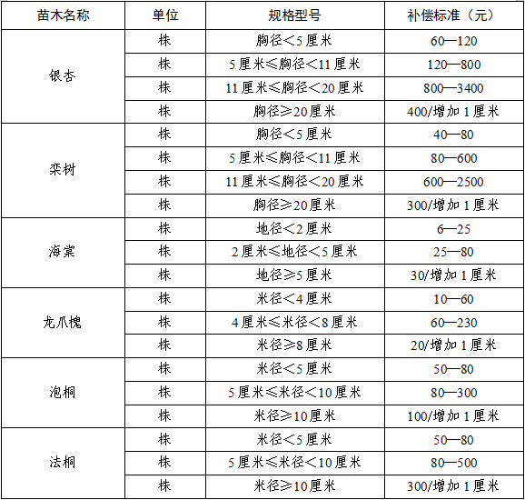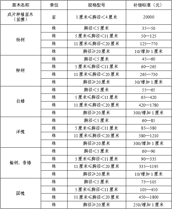 (一)苗木主要指本市造林绿化经常使用的杨树、柳树、白蜡、洋槐、榆树、香椿、国槐、银杏、栾树、海棠、龙爪槐、泡桐、法桐等树种。其他种类苗木和花卉按市场价格进行补偿。