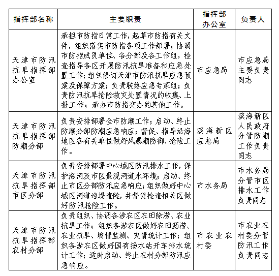 2.1.1 设立天津市防汛抗旱指挥部(以下简称市防指),总指挥由市长担任,副总指挥由分管应急工作的副市长、分管城乡建设工作的副市长、分管水务工作的副市长、分管农业农村工作的副市长、天津警备区副司令员、武警天津总队司令员、市人民政府有关副秘书长和水利部海河水利委员会(以下简称水利部海委)主任、市应急局局长、市水务局局长、市气象局局长担任。市防指日常工作由分管水务工作的副市长负责。