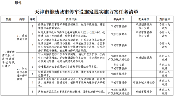 附件:天津市推动城市停车设施发展实施方案任务清单
