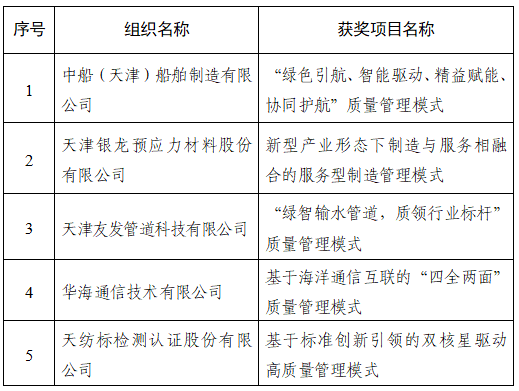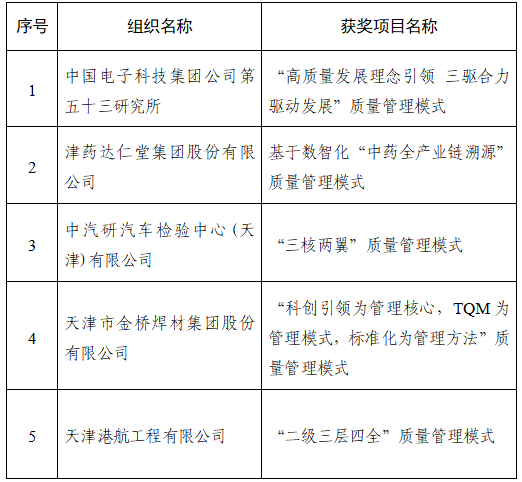 为表彰先进,引导和激励各行业进一步加强质量管理,根据《中华人民共和国产品质量法》、《质量强国建设纲要》、《天津质量奖管理办法》等相关规定,市人民政府决定,授予中国电子科技集团公司第五十三研究所、津药达仁堂集团股份有限公司、中汽研汽车检验中心(天津)有限公司、天津市金桥焊材集团股份有限公司、天津港航工程有限公司等5家组织的先进质量管理模式第六届天津质量奖;授予中船(天津)船舶制造有限公司、天津银龙预应力材料股份有限公司、天津友发管道科技有限公司、华海通信技术有限公司、天纺标检测认证股份有限公司等5家组织的先进质量管理模式第六届天津质量奖提名奖。