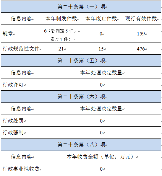 一是全年开具政府信息公开信息处理费缴费通知书4份(根据国办函〔2020〕109号文,行政机关可以向一个自然月内累计申请10件以上的申请人收取信息处理费),未收到缴费,申请人放弃申请。二是根据国家规章库数据入库要求,关于修改、废止规章的决定不再纳入现行有效规章统计范围。