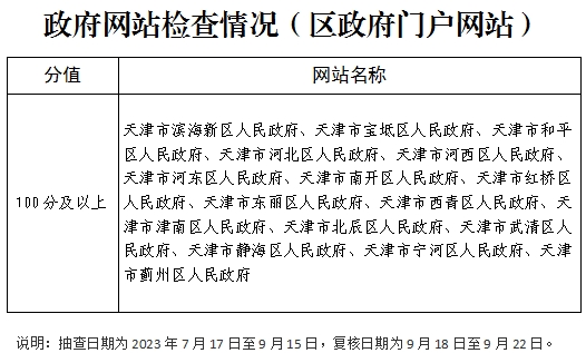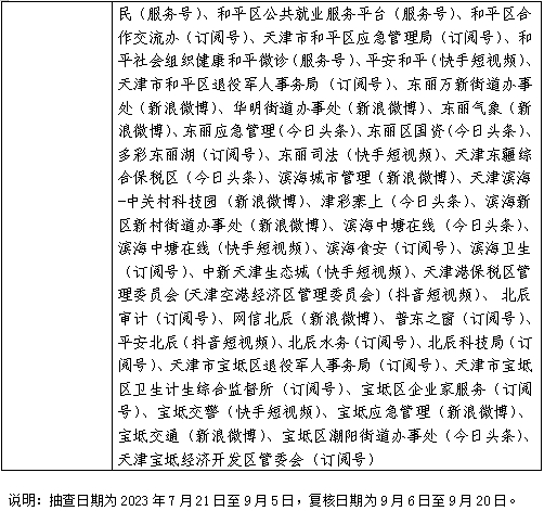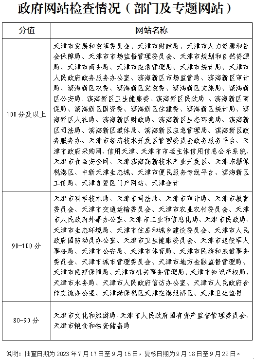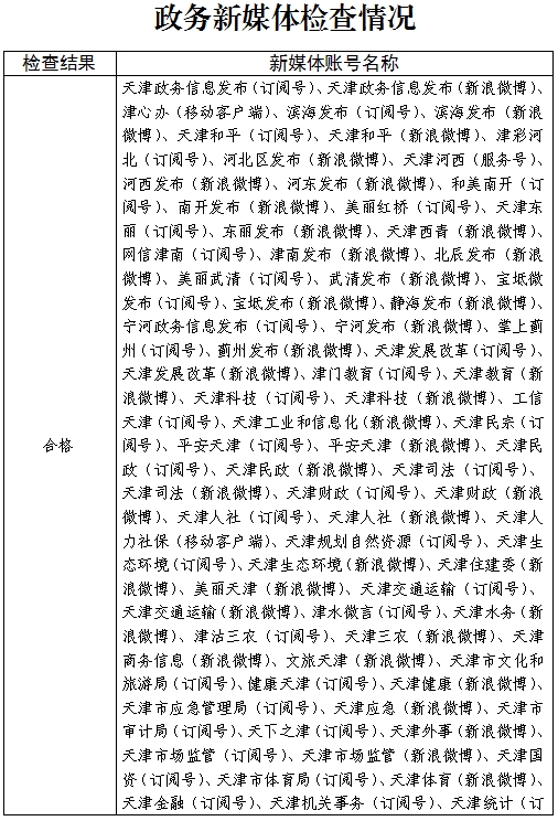 截止2023年9月27日,天津市登记备案的政府网站共87个,政务新媒体1745个,其中检查政府网站87个,检查率100%,合格率100%;抽查政务新媒体204个,抽查率11.69%,合格率100%。