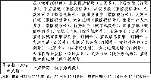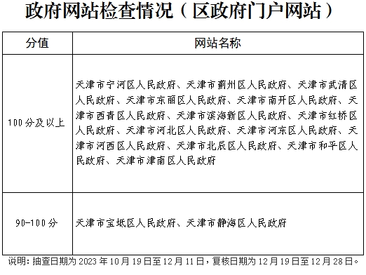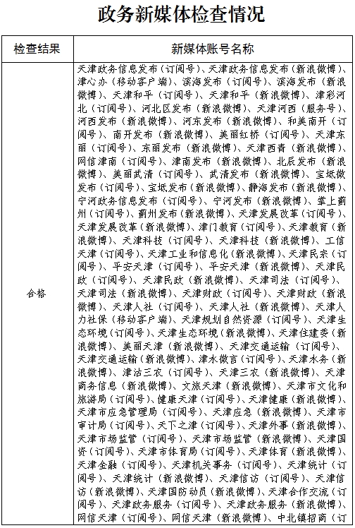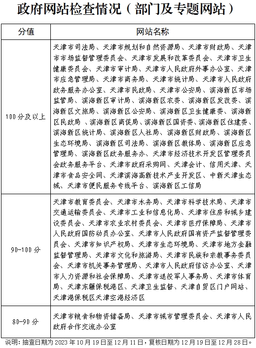 截止2023年12月28日,天津市登记备案的政府网站共87个,政务新媒体1767个,其中检查政府网站87个,检查率100%,合格率100%;抽查政务新媒体208个,抽查率11.8%,合格率99.5%。