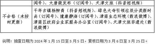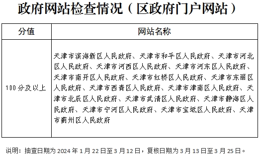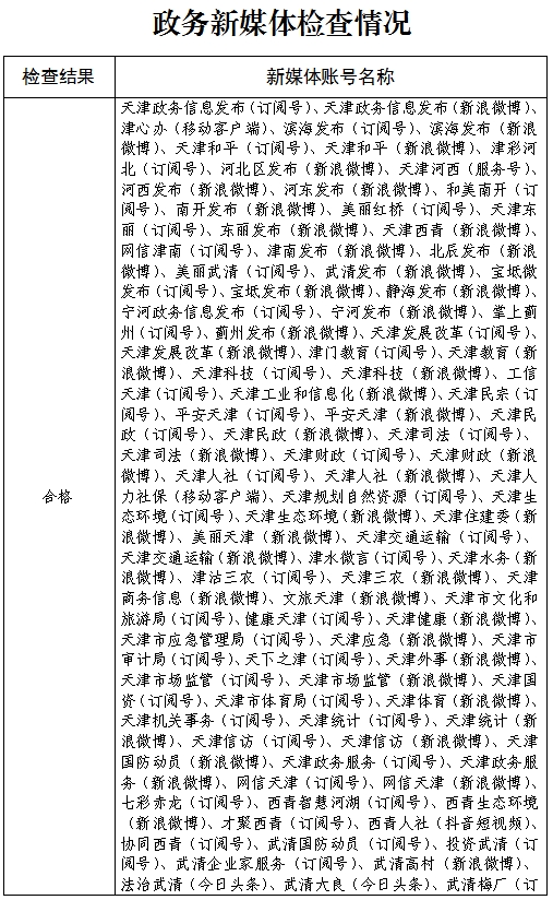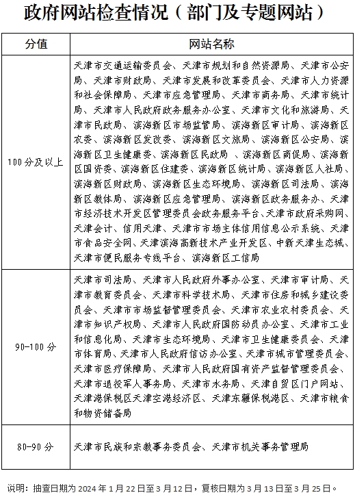 截止2024年3月28日,天津市登记备案的政府网站共84个,政务新媒体1770个,其中检查政府网站84个,检查率100%,合格率100%;抽查政务新媒体207个,抽查率11.7%,合格率97.1%。