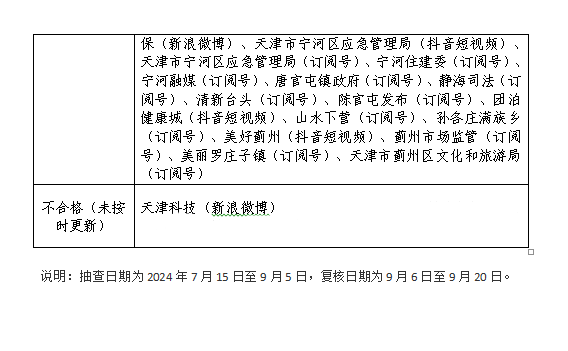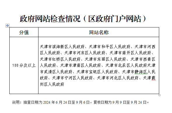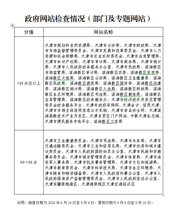 按照国务院办公厅有关政府网站和政务新媒体常态化监管工作要求,我市组织开展了2024年第三季度政府网站和政务新媒体日常检查,截止2024年9月29日,天津市登记备案的政府网站共84个,政务新媒体1745个,其中检查政府网站84个,检查率100%,合格率100%;抽查政务新媒体197个,抽查率11.3%,合格率98.5%。